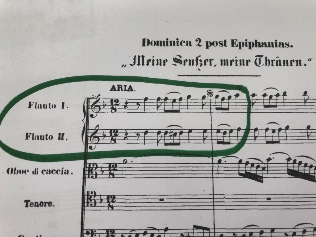 There is more in this opening chorus of Cantata 13 that gives us a peek into Bach’s referencing process. Bach often uses recorders to introduce sorrow. Early in his career he had done this in the opening movements of Cantata 106 Gottes Zeit ist die allerbeste Zeit (written in 1707) and Cantata 161 Komm, du süße Todesstunde (1716). Even during his first year in Leipzig, in 1723, he used this “tool” in the opening chorus of Cantata 46 Schauet doch und sehet, ob irgendein Schmerz sei (which would later form the basis for the Qui tollis from the Mass in B minor). And while from the mid 1720s most Baroque composers, including Bach himself, favored the more fashionable French transverse flutes over recorders, Bach still uses recorders to illustrate impending sorrow or death’s slumber in his Easter Oratorio (1725) and his St. Matthew Passion (1727). Click on the links to hear/watch recordings of all these examples on YouTube. Names of performers in all these are listed at the very end of this post.**